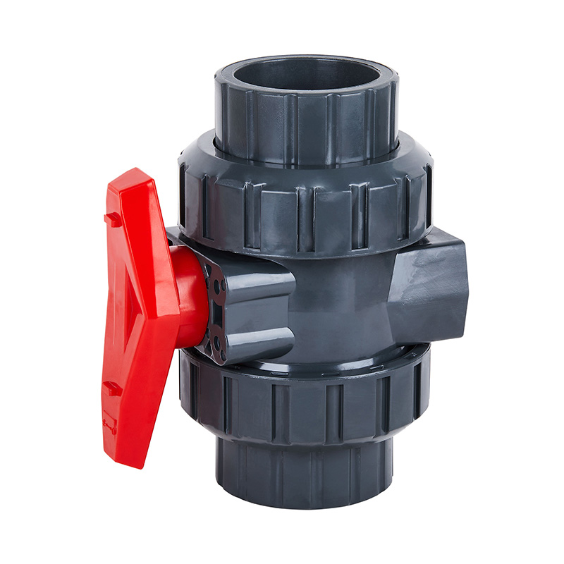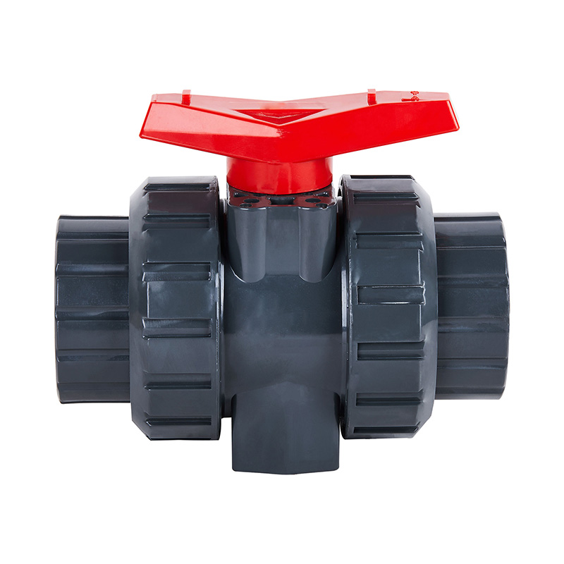 Vlastné DN15, DN80, DN100 Strednoteplotný PVC-U Guľový ventil s dvojitým hrdlom, manuálny, DN15–100 1,0–1,6 MPa priemyselný plastový ventil ANSI štandard