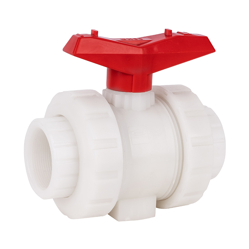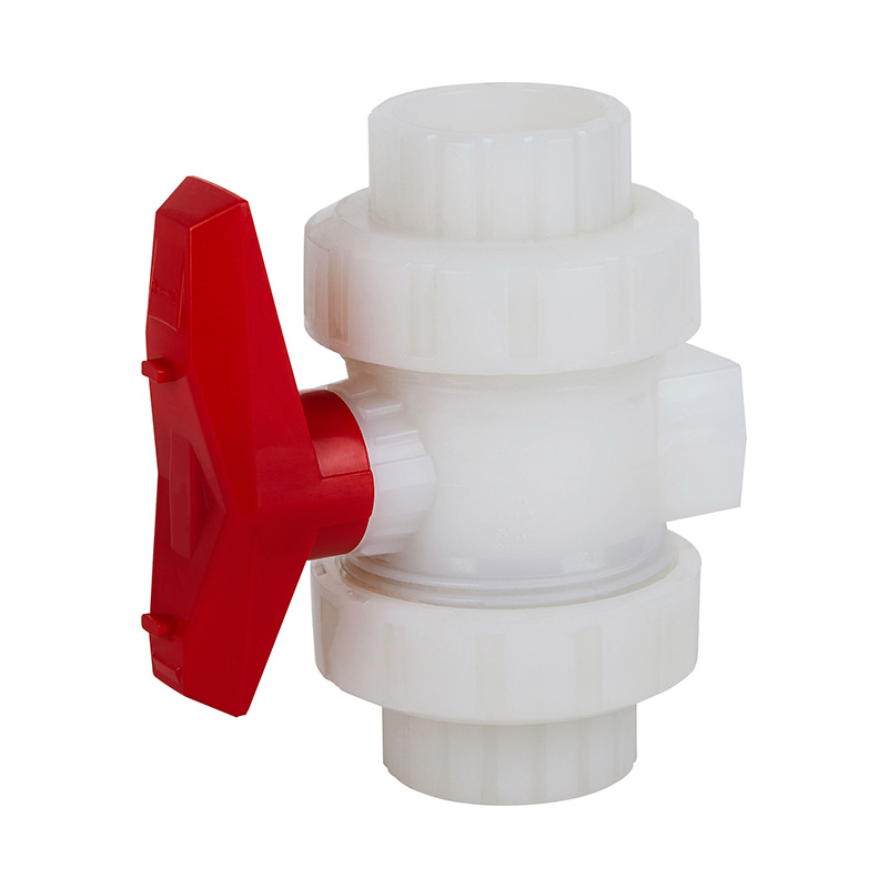 Biely 20mm-110mm vysokoteplotný super odolný Štandardný PVDF guľový ventil s dvojitým hrdlom 1,0-1,6 MPa ISO STD Štandardný priemyselný plastový ventil